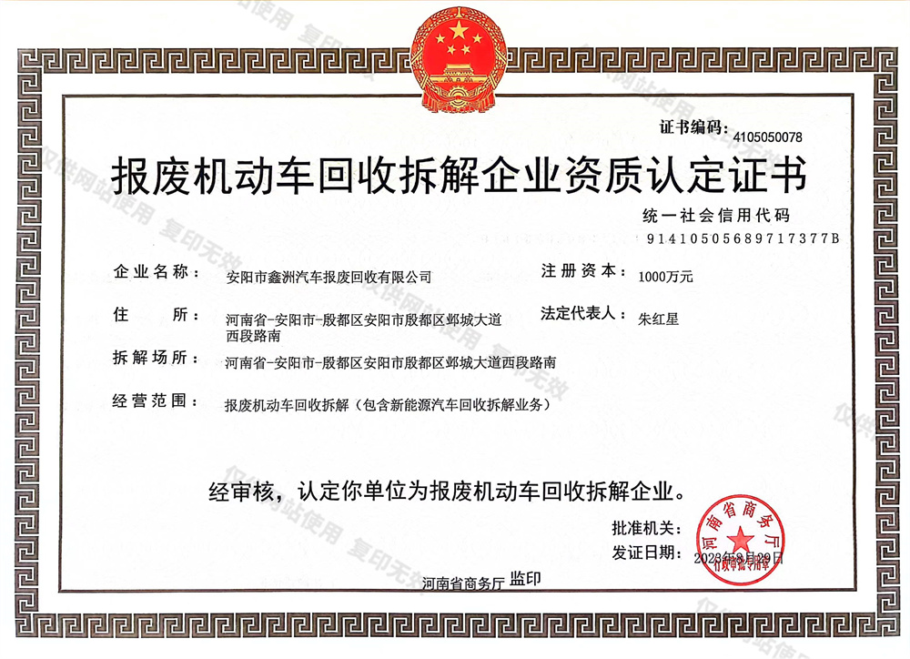 安陽市鑫洲汽車報廢回收有限公司是經(jīng)國家商務(wù)部和省商務(wù)廳批準備案的報廢汽車回收拆解定點企業(yè)。公司主要從事報廢汽車、黃標車的回收拆解,銷售可再生利用的舊汽車配件,辦理報廢汽車回收證明、車輛銷戶、車輛補貼資金申報等。